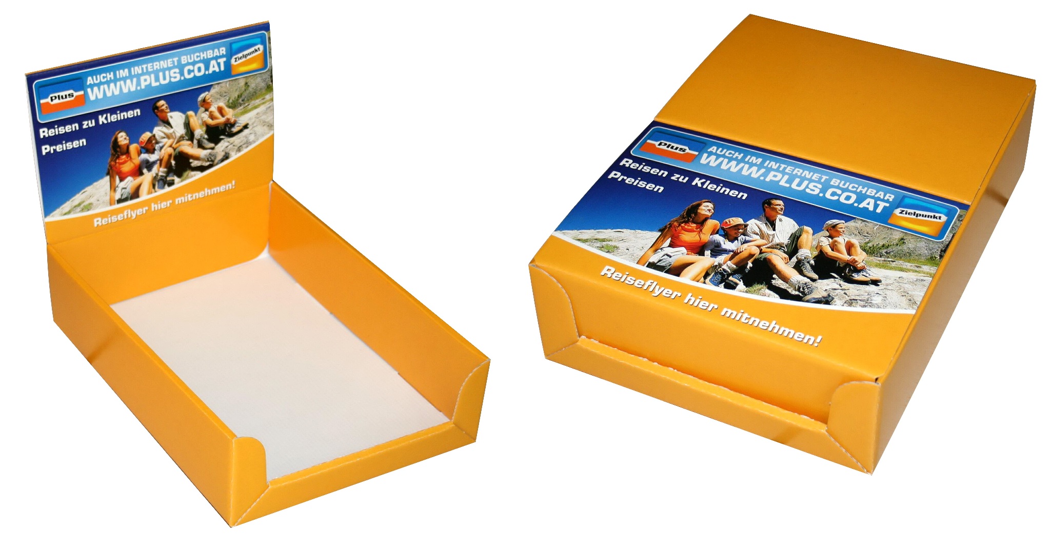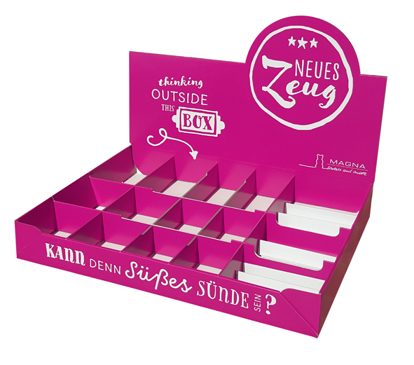 Je nachdem, was Sie auf Ihrer Theke zur Schau stellen möchten, bieten sich unterschiedliche Displays ein. Sie können sich beispielsweise für ein Thekendisplay aus Pappe entscheiden, das die Form eines kleinen Kartons hat. Solche Modelle sind ideal, um sie mit verschiedenen Artikeln zu befüllen. Darin können Sie beispielsweise stark reduzierte Produkte oder Sonderangebote unterbringen. Wenn Sie einen bestimmten Artikel in Ihrem Thekendisplay zur Schau stellen möchten, können wir Ihnen auch ein Modell anfertigen, das mit passenden Produktausstanzungen ausgestattet ist. Zudem ist bei uns auch ein Theken-Display erhältlich, das mit treppenartigen Stufen ausgestattet ist. So können Sie die einzelnen Artikel noch besser präsentieren.